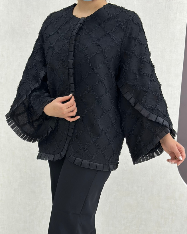 ویژگی بارز مانتو نیلان، طراحی آستینهای دو لایه و کلوش آن است که حجمی زیبا و حرکتی چشمنواز به لباس بخشیده است. این مدل آستین در کنار قد کوتاه مانتو، توازنی عالی برای یک استایل نیمهرسمی و شیک ایجاد کرده است.