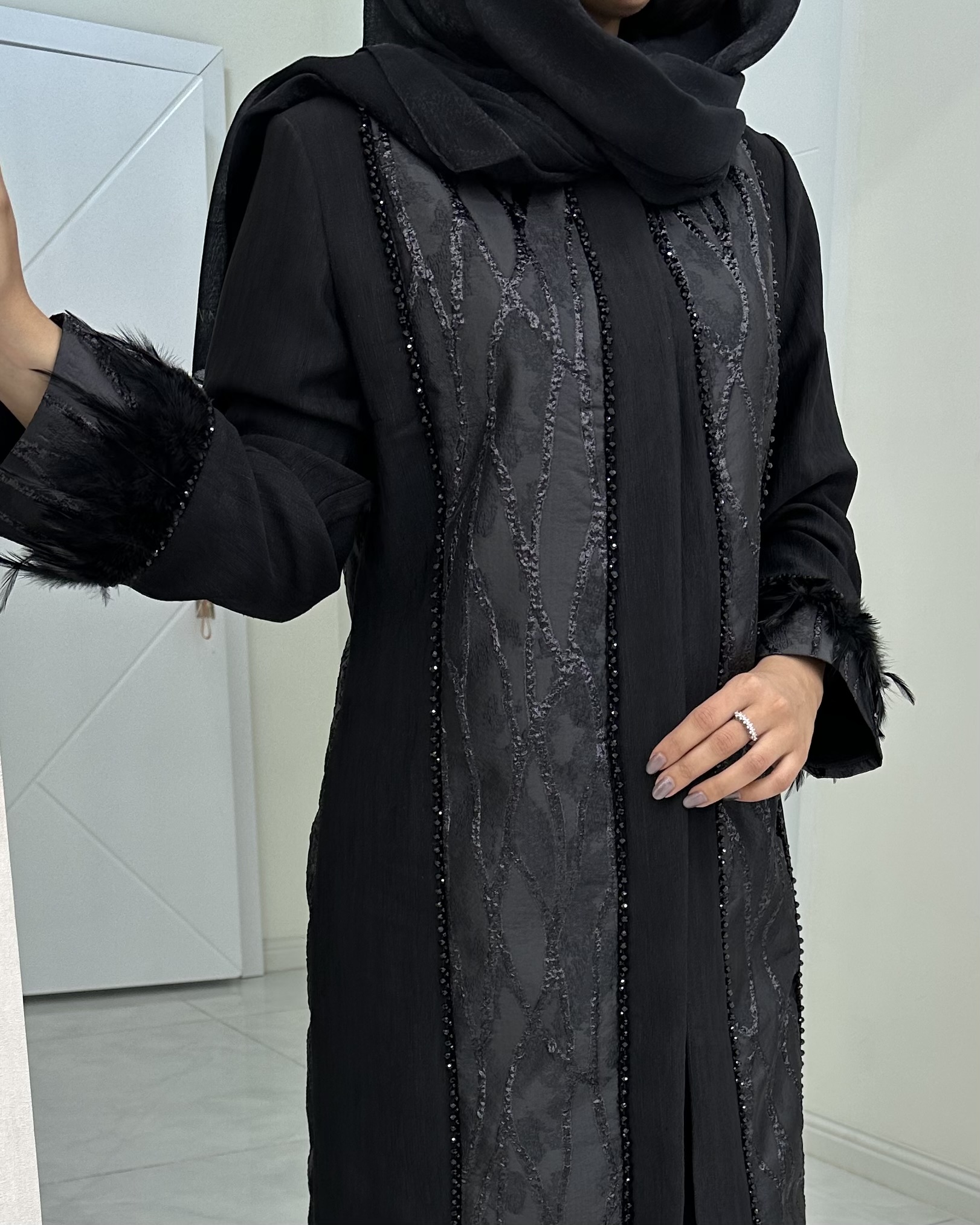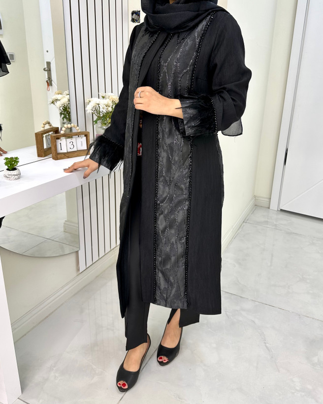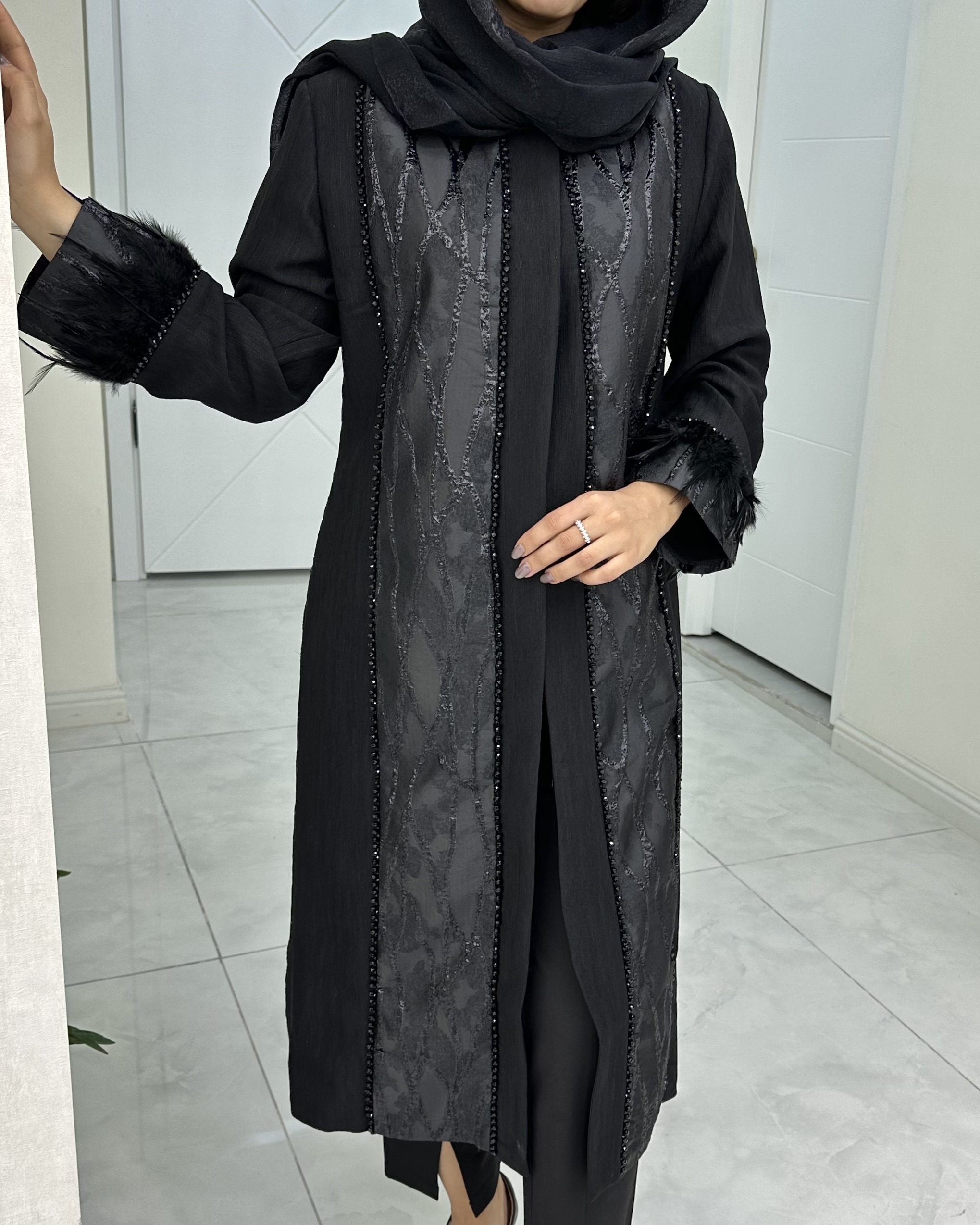نقطه عطف این محصول، سنگدوزیهای دستی بسیار پرکار و ظریفی است که روی آن اجرا شده است. این جزئیات دستدوز، مانتو هانا را از یک پوشش معمولی به یک اثر هنری تبدیل کرده که در هر مجلسی نگاهها را به سمت شما خیره میکند.